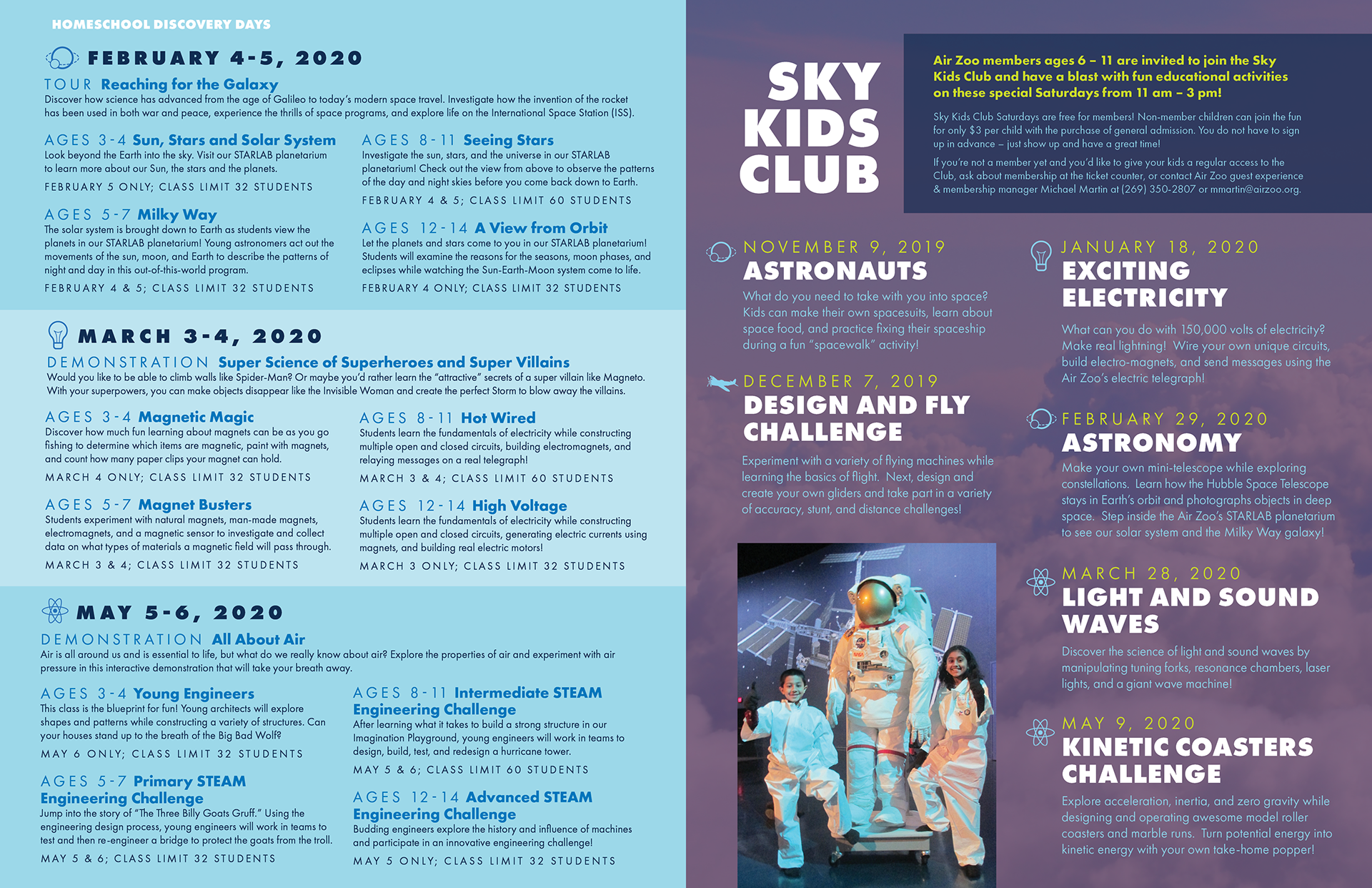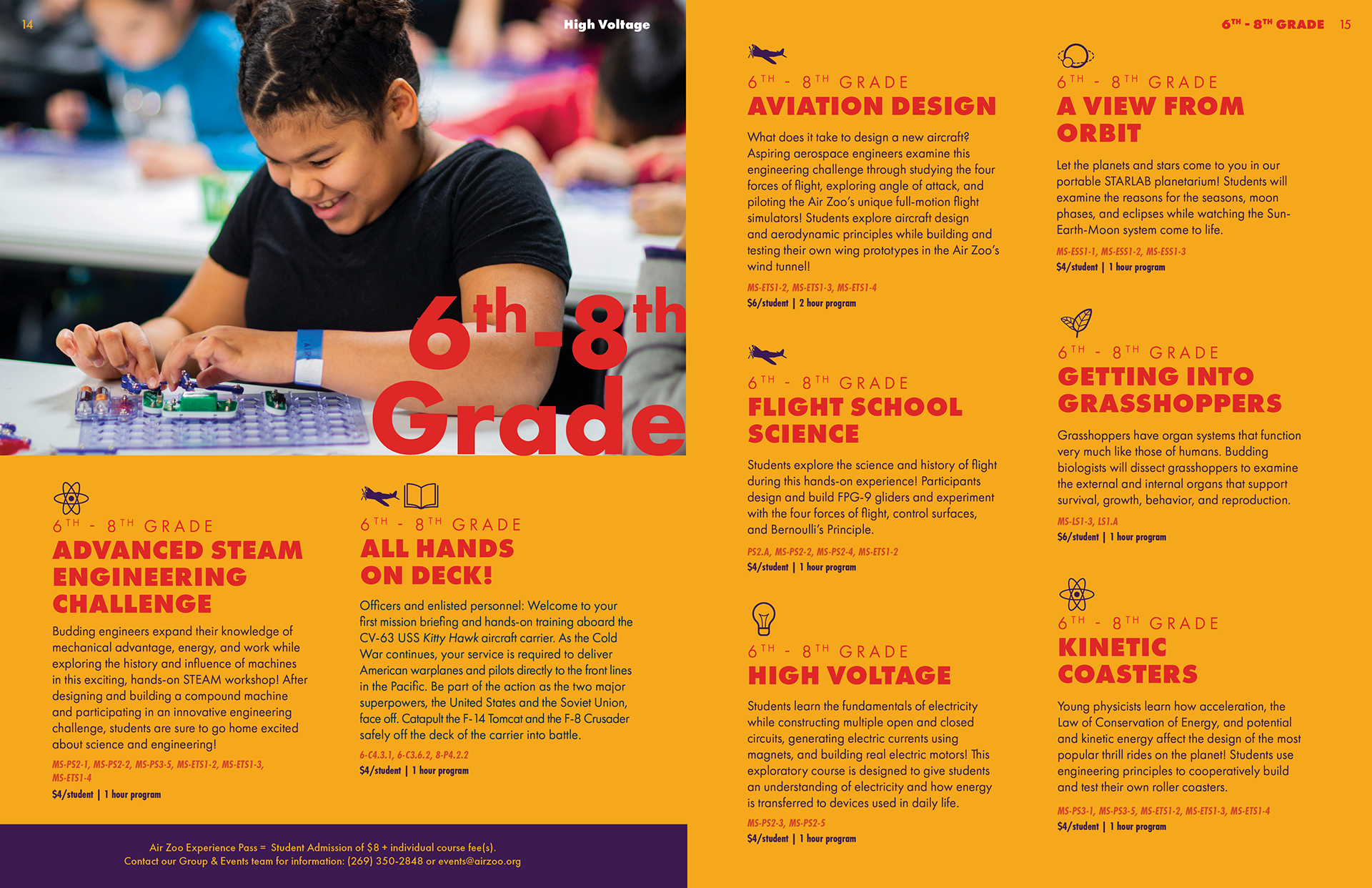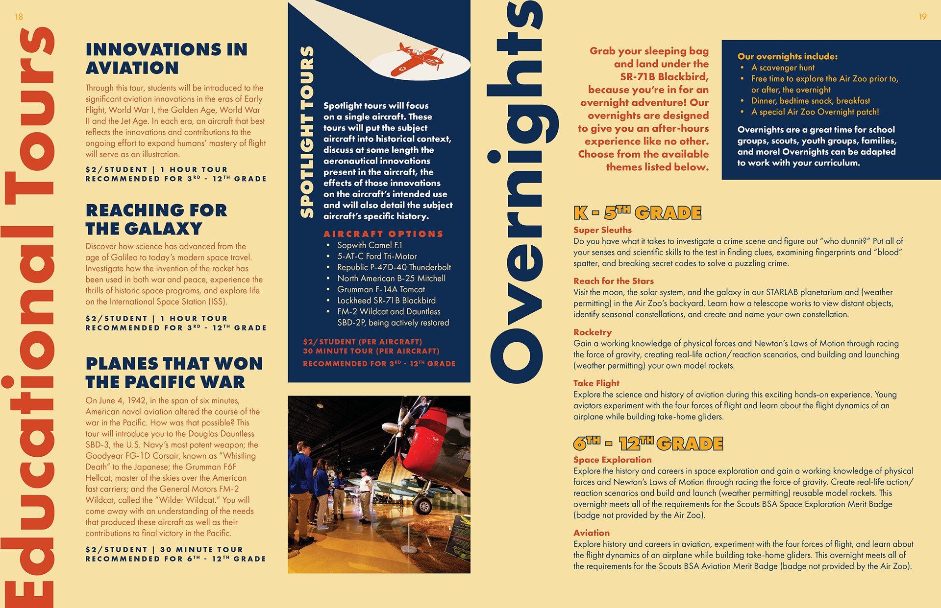 This product is one that the Air Zoo’s education department distributes to teachers and homeschooling parents across Michigan, Indiana and Illinois, and highlights all of the programs we have to offer. Previous versions had been less effective due to information overload, overuse of tiny pictures, and [shudders] clip art. My mission was to make this as clean, organized, and simple as possible, and align it with the Air Zoo’s current brand. I’m really proud of the result and grateful for the team that collaborated and helped me turn out the most user-friendly and on-brand version of this product.