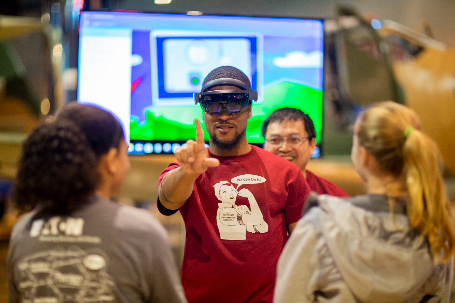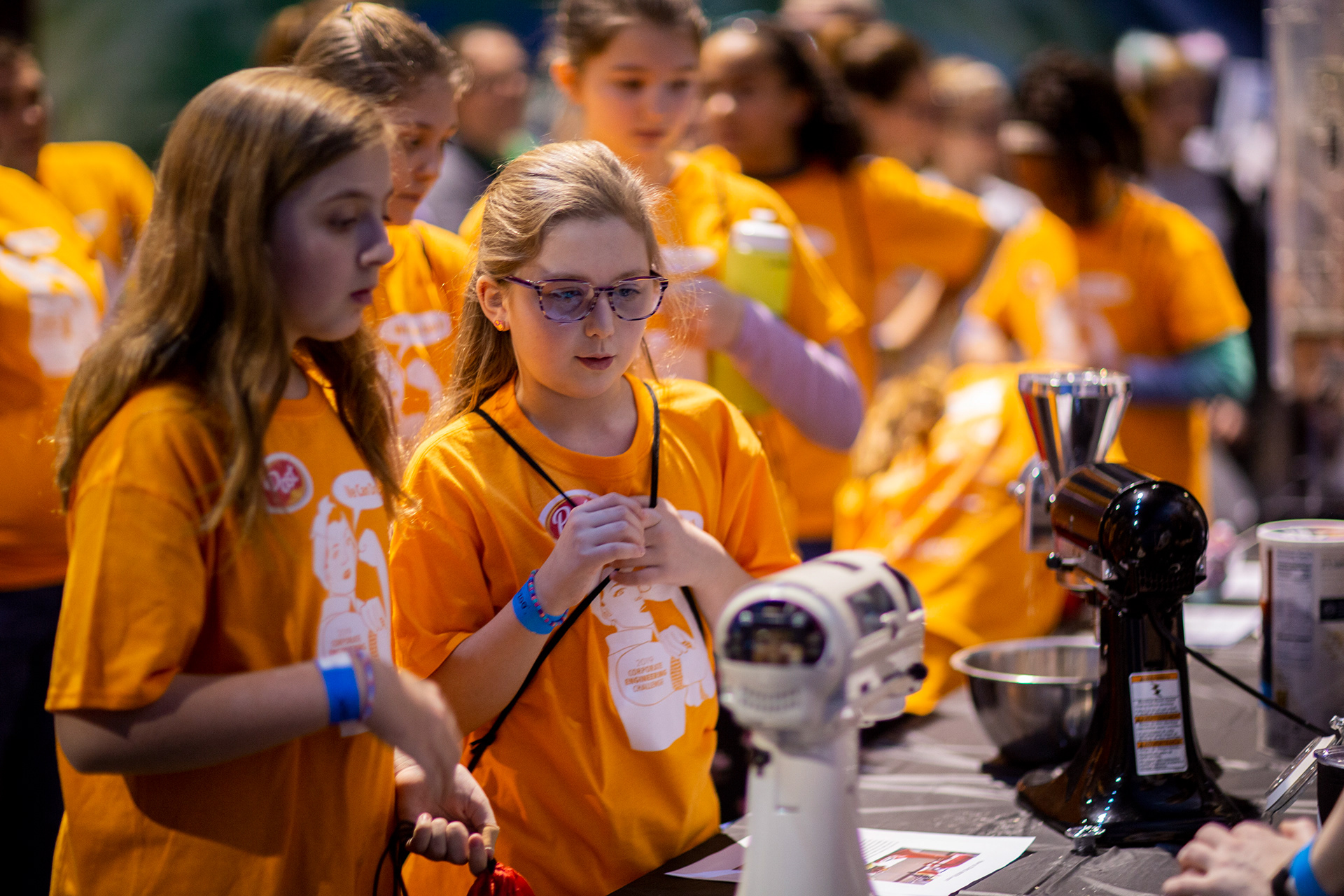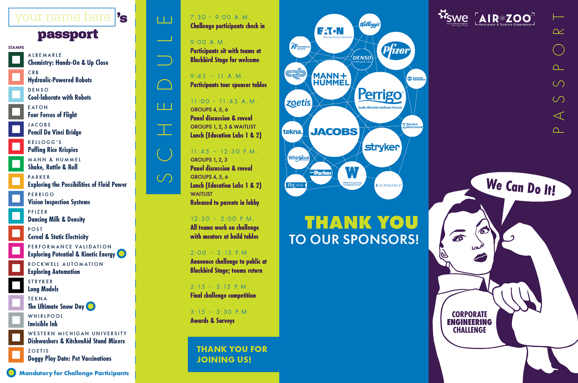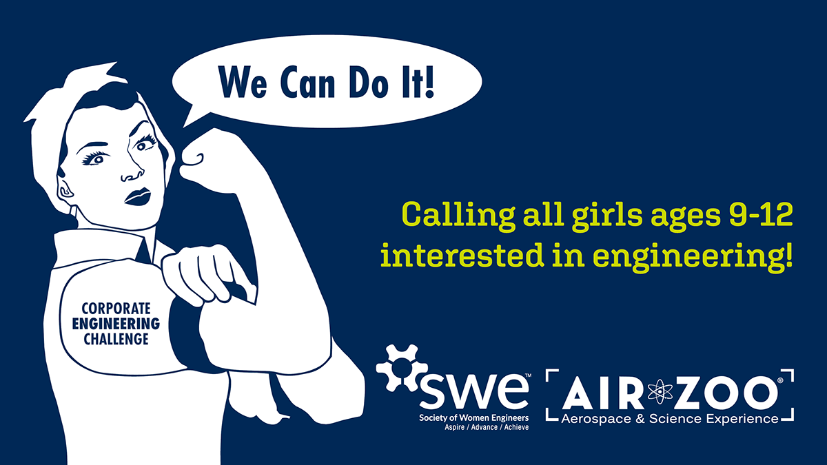 Rosie the Riveter was the perfect avatar for the Society of Women Engineers’ Corporate Engineering Challenge. This event, held annually at the Air Zoo in February, brings together between 150 and 200 girls ages 9-12 who are interested in engineering, and connects them with local corporations who employ women as engineers. The girls, broken into teams led by grownup engineers, visit the corporations’ tables and do fun engineering activities to fill up their event passports. Then the challenge itself begins – each team must engineer a creation that can accomplish an assigned task.
